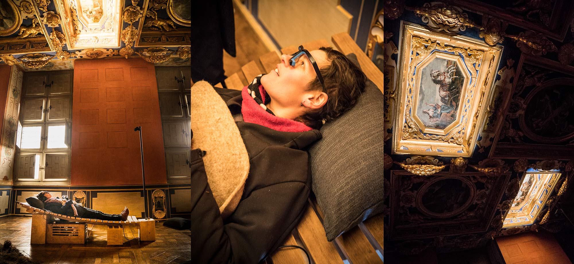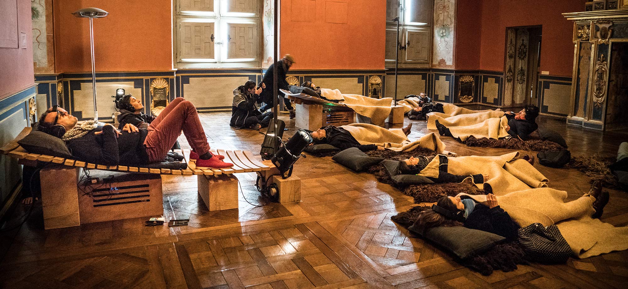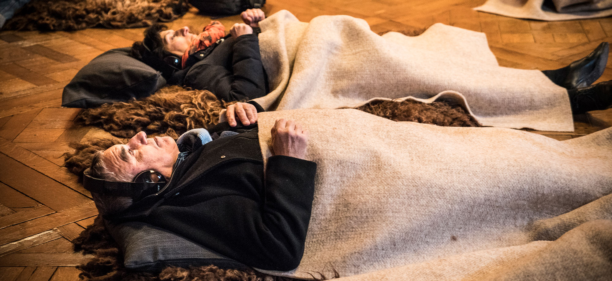 Conçue comme une installation et une expérience à vivre, la création proposée par Pierre Redon dans la chambre du roi prend la forme de compositions sonores à expérimenter. Le public est invité à prendre place sur des chaises longues recouvertes de toisons et de couvertures de laine pour s’immerger dans un voyage artistique.